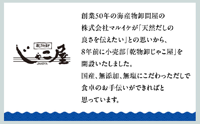 私たちじゃこ屋は、鹿児島の豊かな海の恵みを活かし、無添加のだし、ちりめん、煮干しなどの乾物を通じて、安心・安全で高品質な商品をお届けしております。すべての商品は国産にこだわり、厳しい品質管理のもとでお客様に安心してお使いいただけるよう努めております。